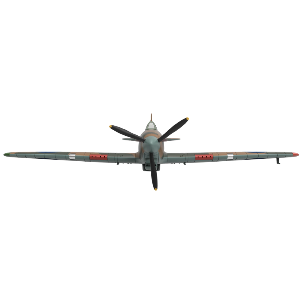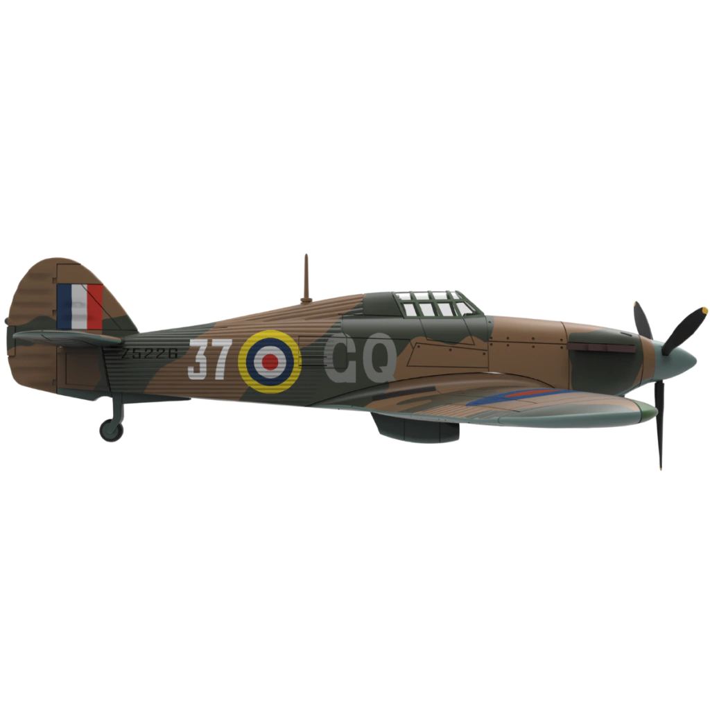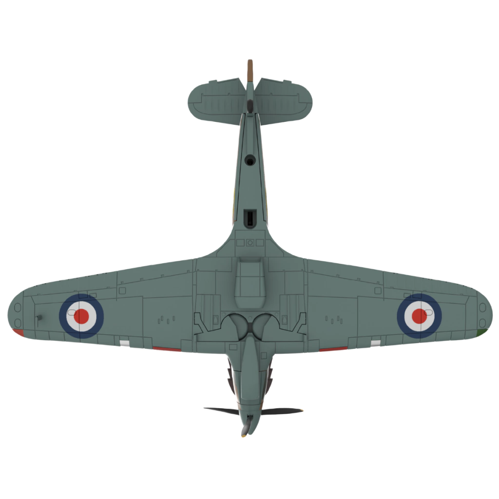 Detalhes impecáveis: Miniatura rica em detalhes que capturam a estrutura robusta e o motor Rolls-Royce Merlin do Hurricane.