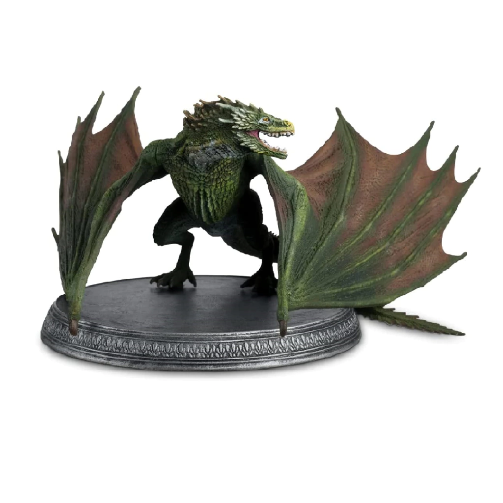 O Dragão verde e bronze, Rhaegal, é uma arma de guerra alada que cospe fogo e se junta à coleção de figurinhas de Game of Thrones bem a tempo! Uma criatura aterrorizante, capaz de devastar cidades, frotas navais e exércitos inteiros com fogo de dragão ardente, Rhaegal é leal à sua 'Mãe', a herdeira Targaryen, Daenerys. Seu modelo pintado à mão retrata Rhaegal enquanto ele se prepara para voar e chover fogo de dragão sobre a Armada dos Mestres, enquanto eles atacam Meereen no episódio 9 da 6ª temporada, 'Batalha dos Bastardos'.