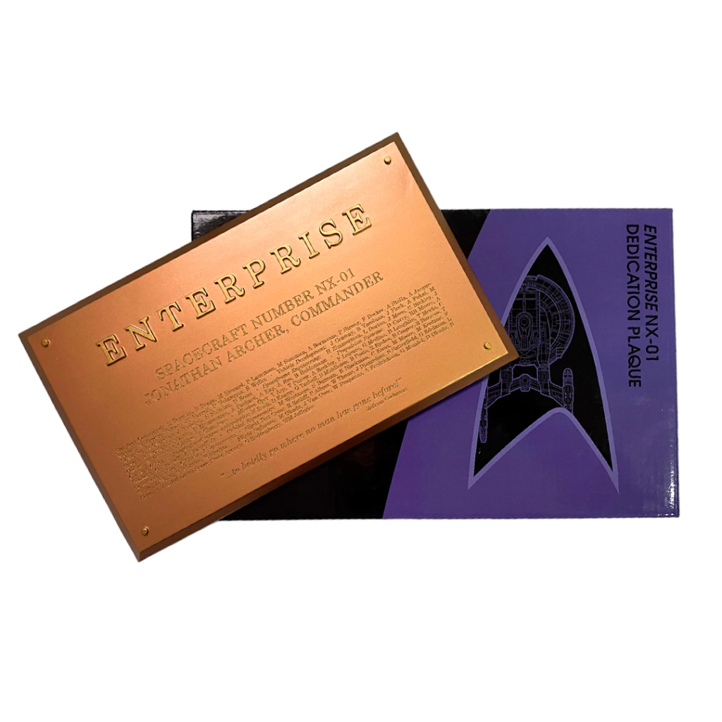 Esta é uma réplica em escala oficialmente licenciada da placa de dedicação que estava na ponte da NX-01. A placa mostra o capitão Jonathan Archer e muitas outras informações. Moldada em resina metálica e requintadamente acabada em efeito bronze.