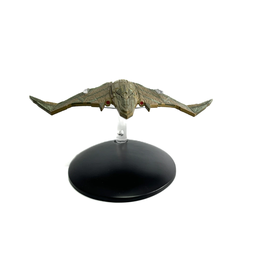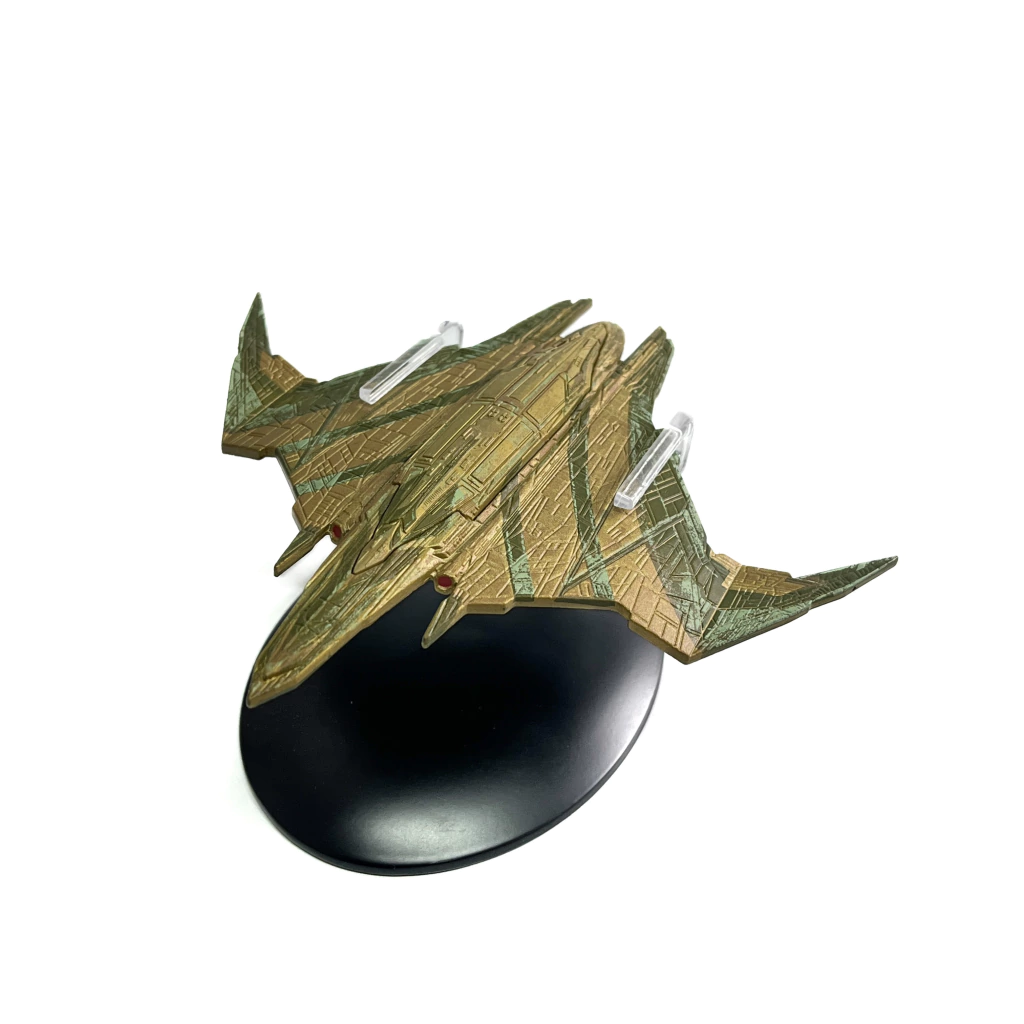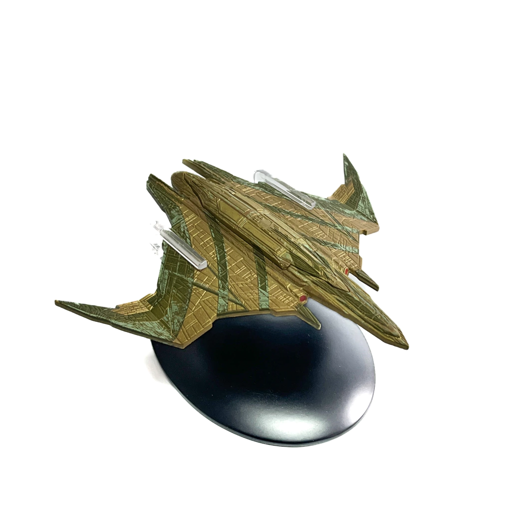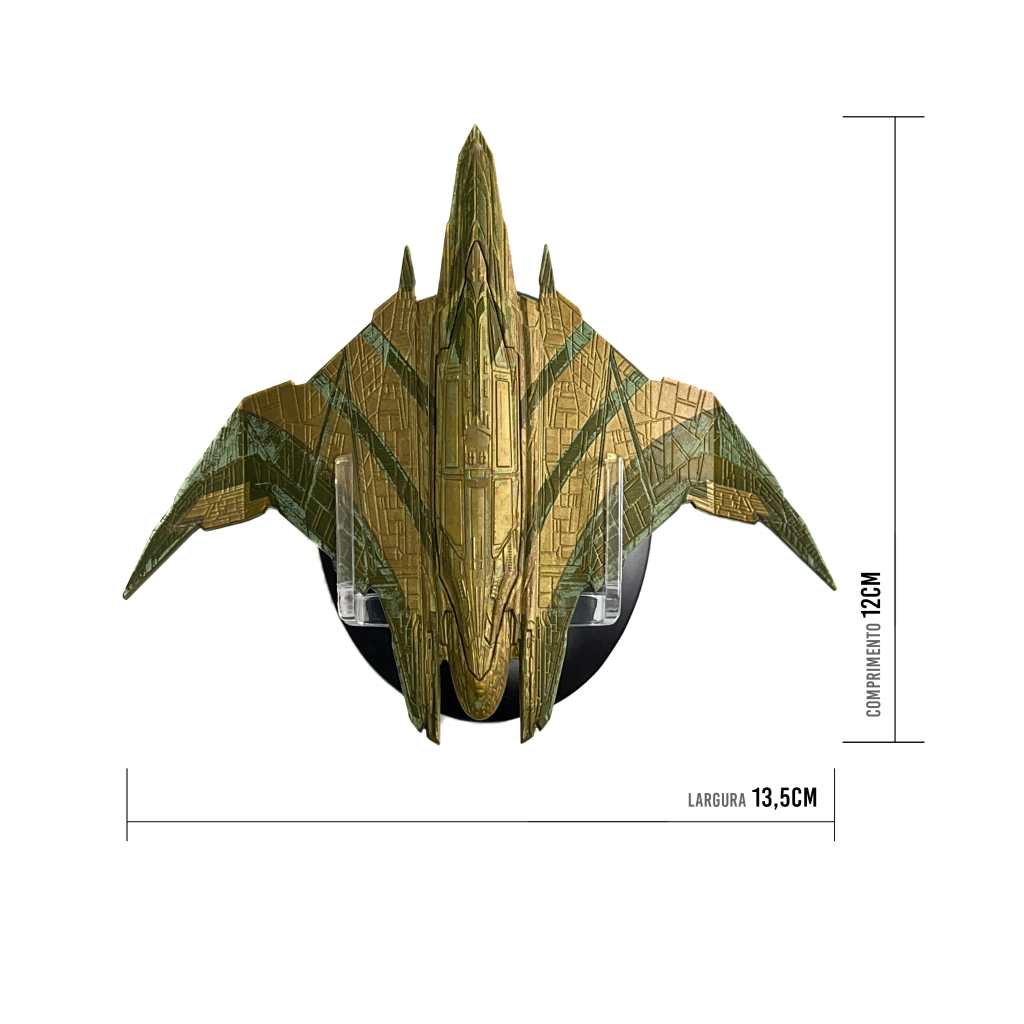 Continuando nossa coleção de naves estelares do universo de Star Trek com a elegante Romulan Flagship! Uma nave Romulana esguia e elegante projetada como uma nave de guerra, ela ostentava as ""asas"" em forma de meia-lua características das embarcações romulanas, bem como uma janela de ponte proeminente. Desenvolvida nos anos após a destruição de Romulus, esta nave passou por uma implantação em massa acima do planeta Coppelius - onde se enfrentou a uma frota da Federação liderada por William T. Riker! Esta réplica da Romulan Flagship é baseada diretamente nos modelos VFX originais para garantir uma precisão extraordinária e é acompanhada por uma revista de holofotes incluindo especificações da nave estelar e entrevistas com designers. Características do produto: Produzido em uma combinação resistente de metal fundido e plástico ABS 12,5 cm de comprimento Apresenta uma revista emocionante com especificações detalhadas de naves estelares e entrevistas com designers.