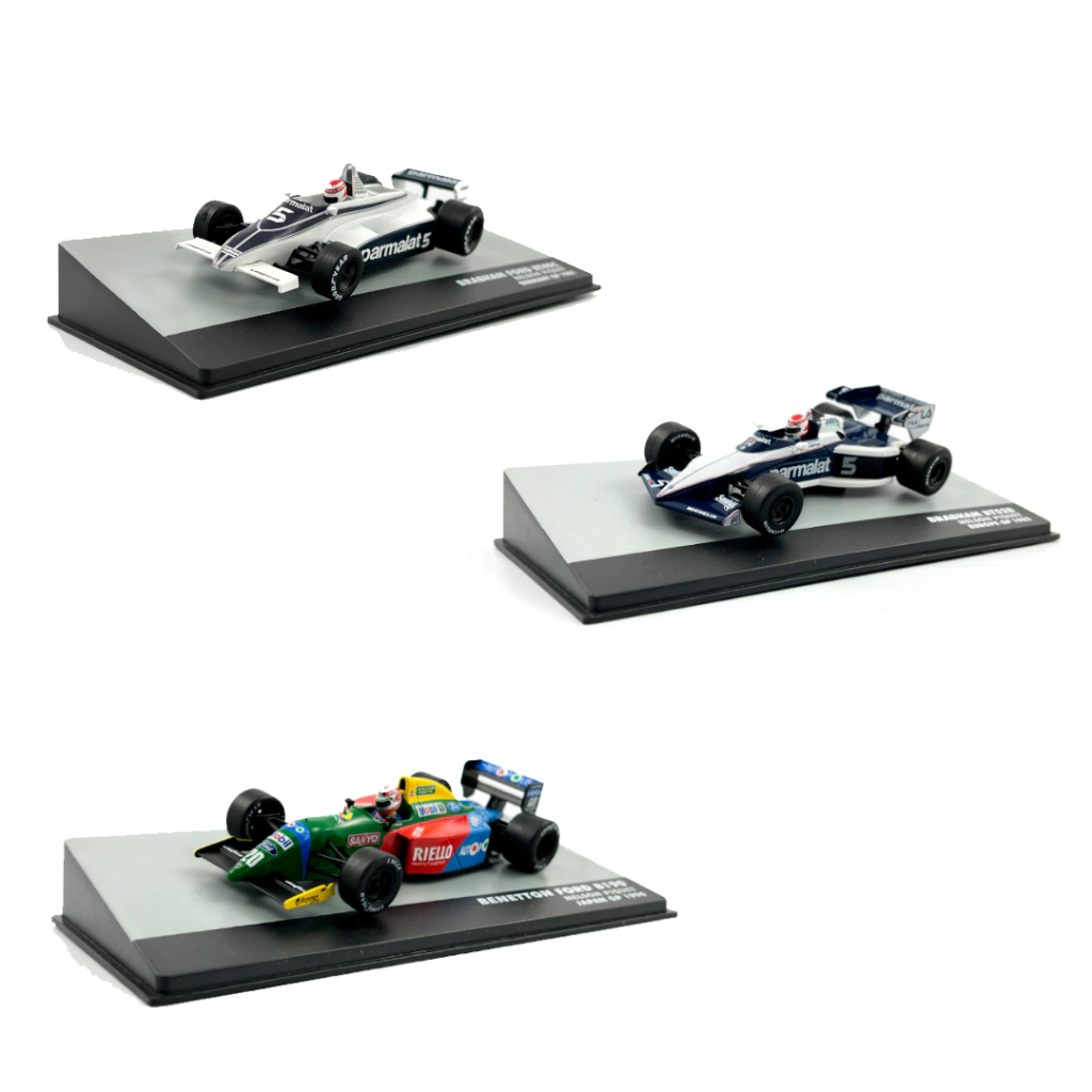 Apresentamos esse combo exclusivo de carros de Fórmula 1, dedicada à lendária carreira do piloto Nelson Piquet. Essa coleção icônica reúne três dos carros mais marcantes que levaram Piquet à vitória e ao estrelato no automobilismo: o Brabham BT49C de 1981, o Brabham BT52B de 1983 e o Benetton B190 de 1990.