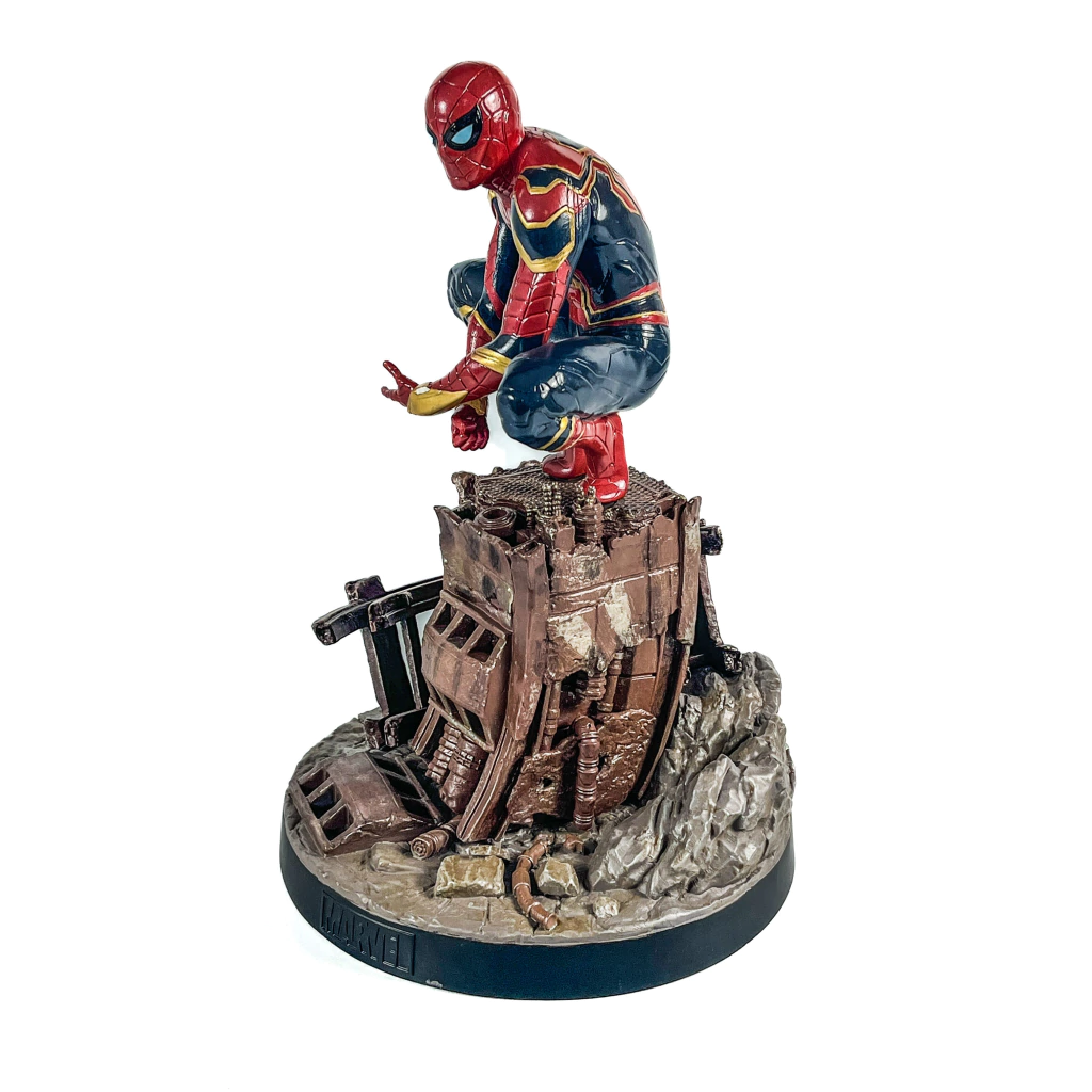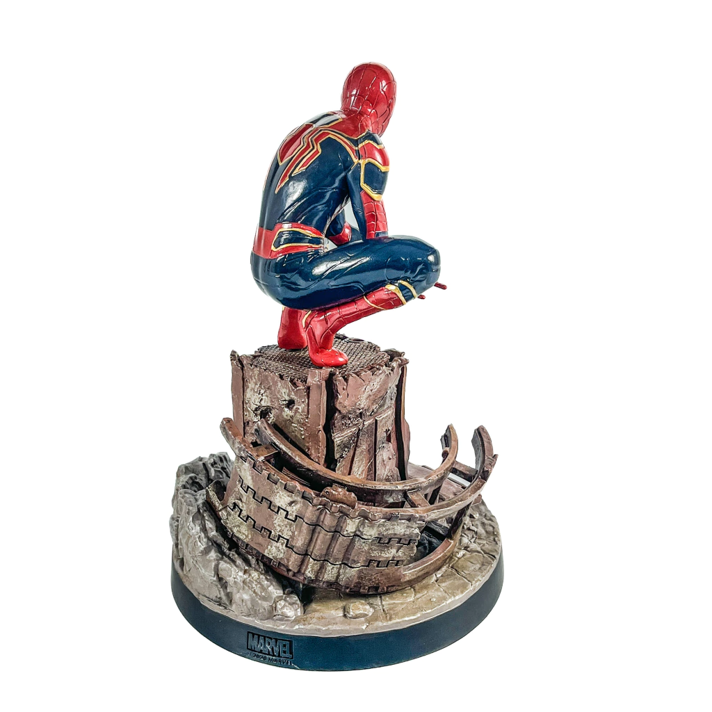O Aranha de Ferro posicionado sobre uma estrutura de ferro personalizada, adicionando estabilidade e um toque de autenticidade ao cenário. A base é habilmente esculpida para parecer robusta, adicionando um elemento industrial à peça.